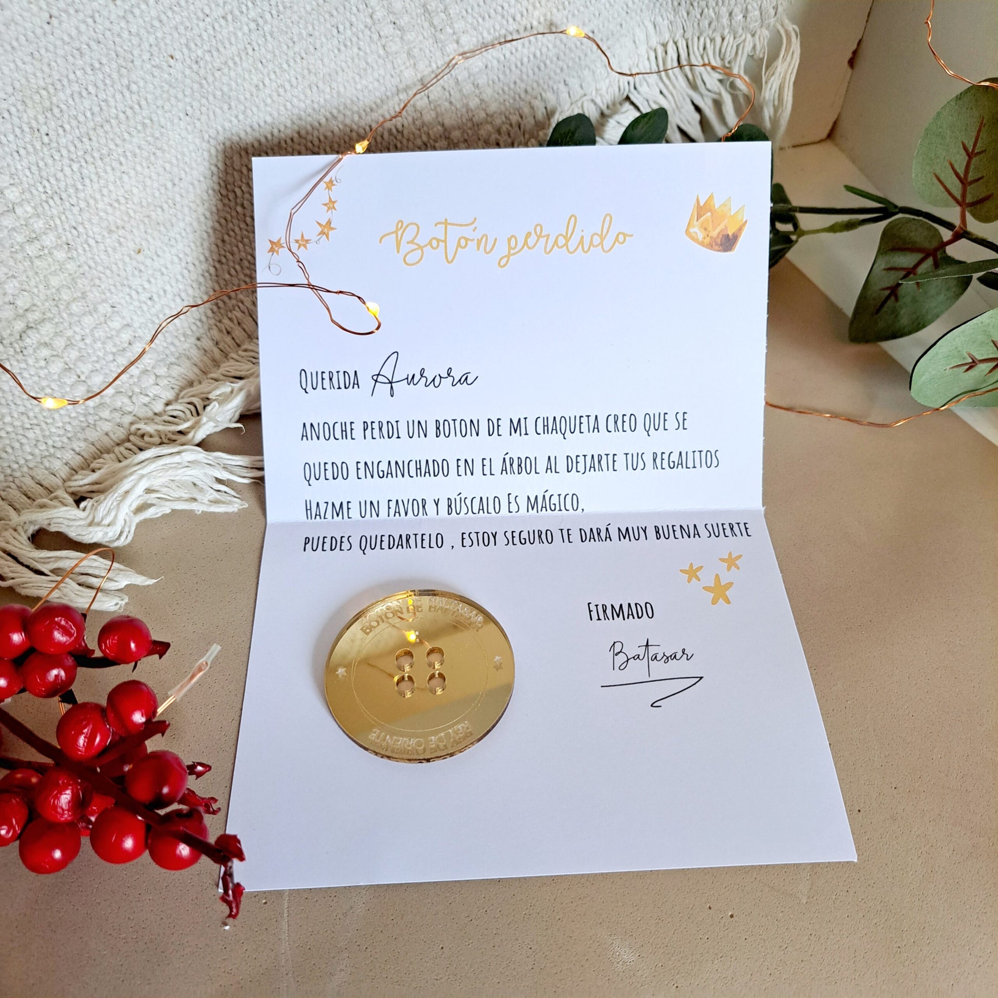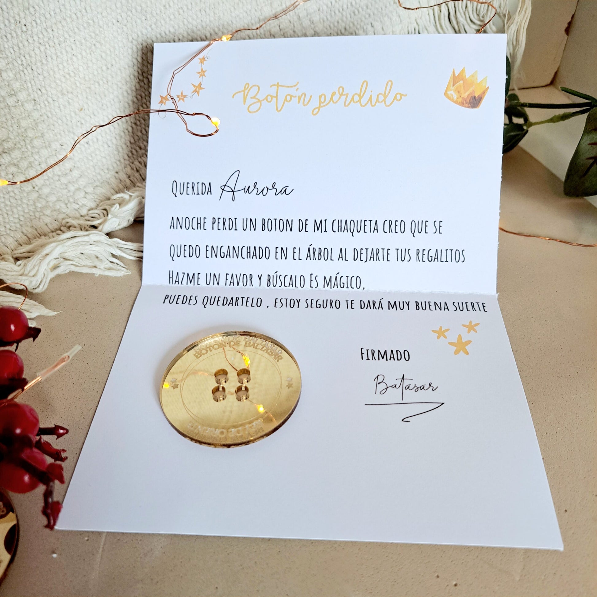 El botón mide 5cm es dorado y tiene sus hilos de oro! , viene con una cartita con el nombre del peque , no olvides escribirlo¡