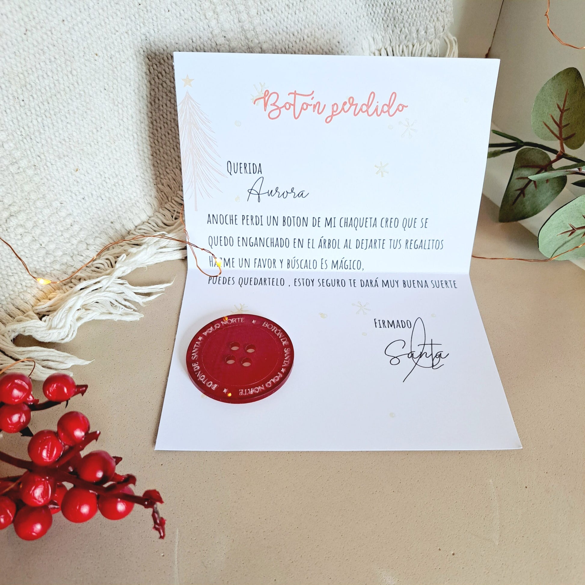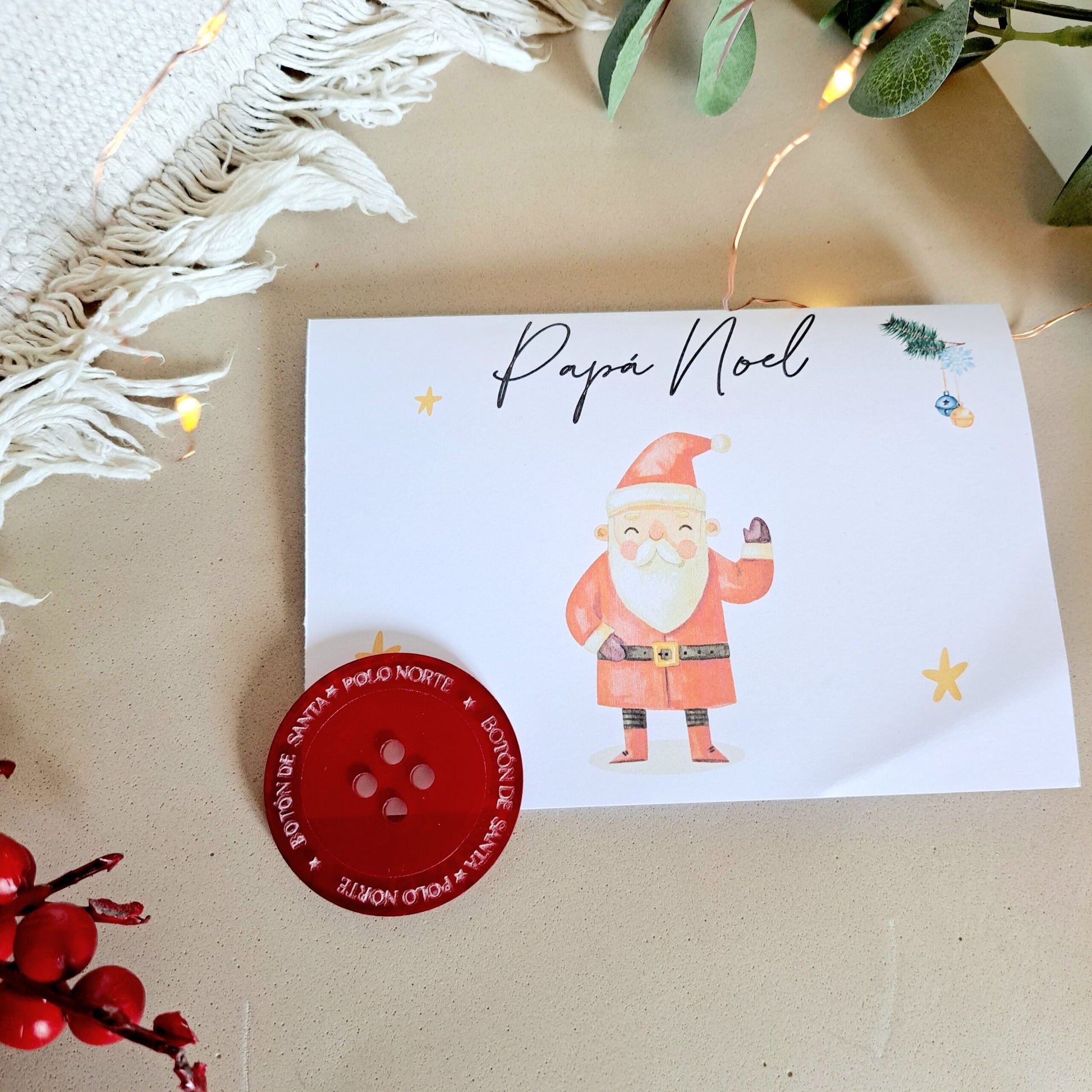 Incluye el botón perdido de santa con su hilo blanco, y una pequeña carta en tamaño A5 que va en una bolsita de plástico.