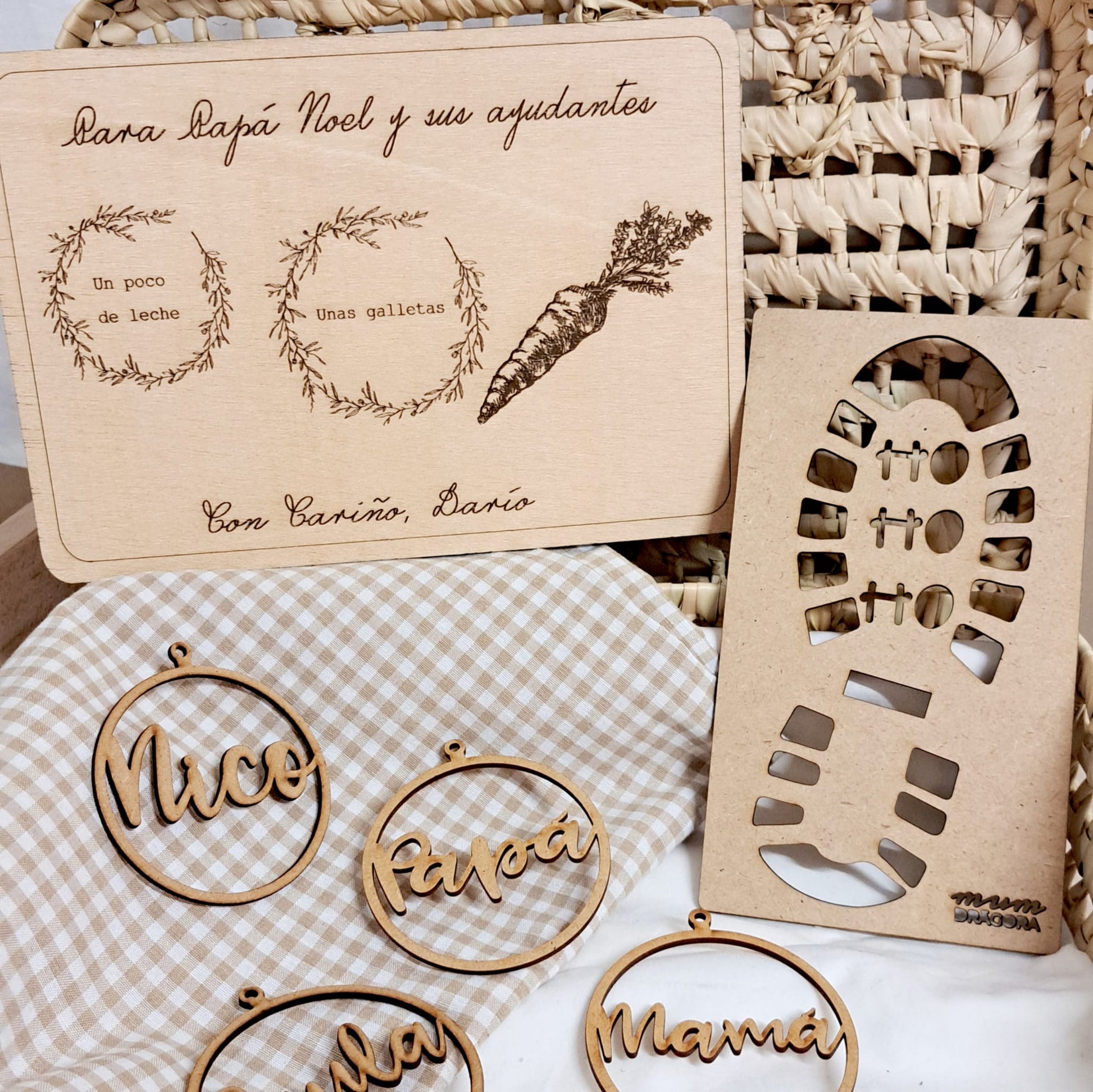 🎅✨ Haz de esta Navidad una noche mágica con nuestro exclusivo Pack Navidad para Papá Noel. Este set incluye una bandeja personalizada para dejar comida y bebida para Papá Noel y sus renos 🥛🍪, tres bolas de Navidad personalizadas 🎄 con un toque único, y una huella especial de Papá Noel 👣 para colocar en el suelo y sorprender a los pequeños.